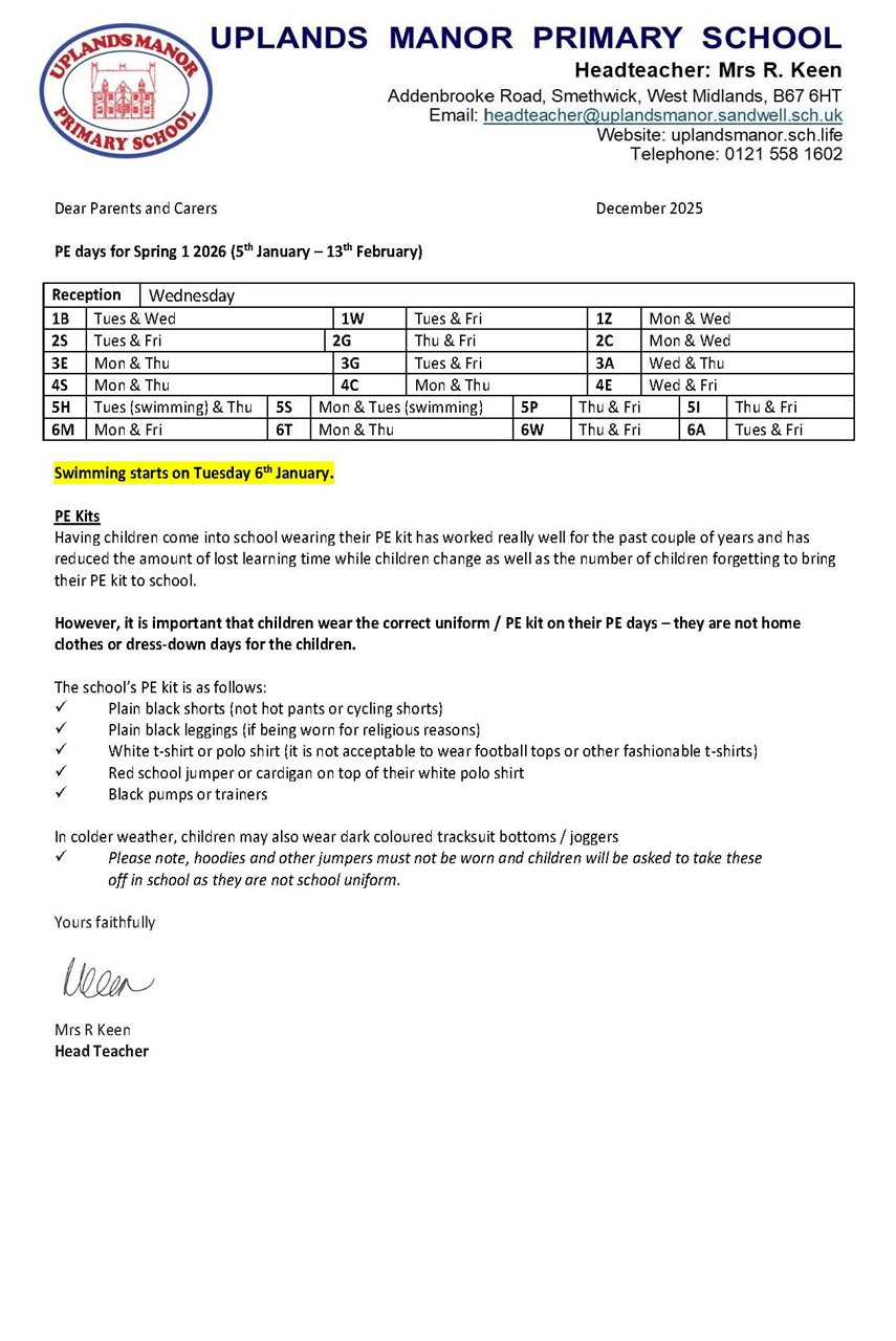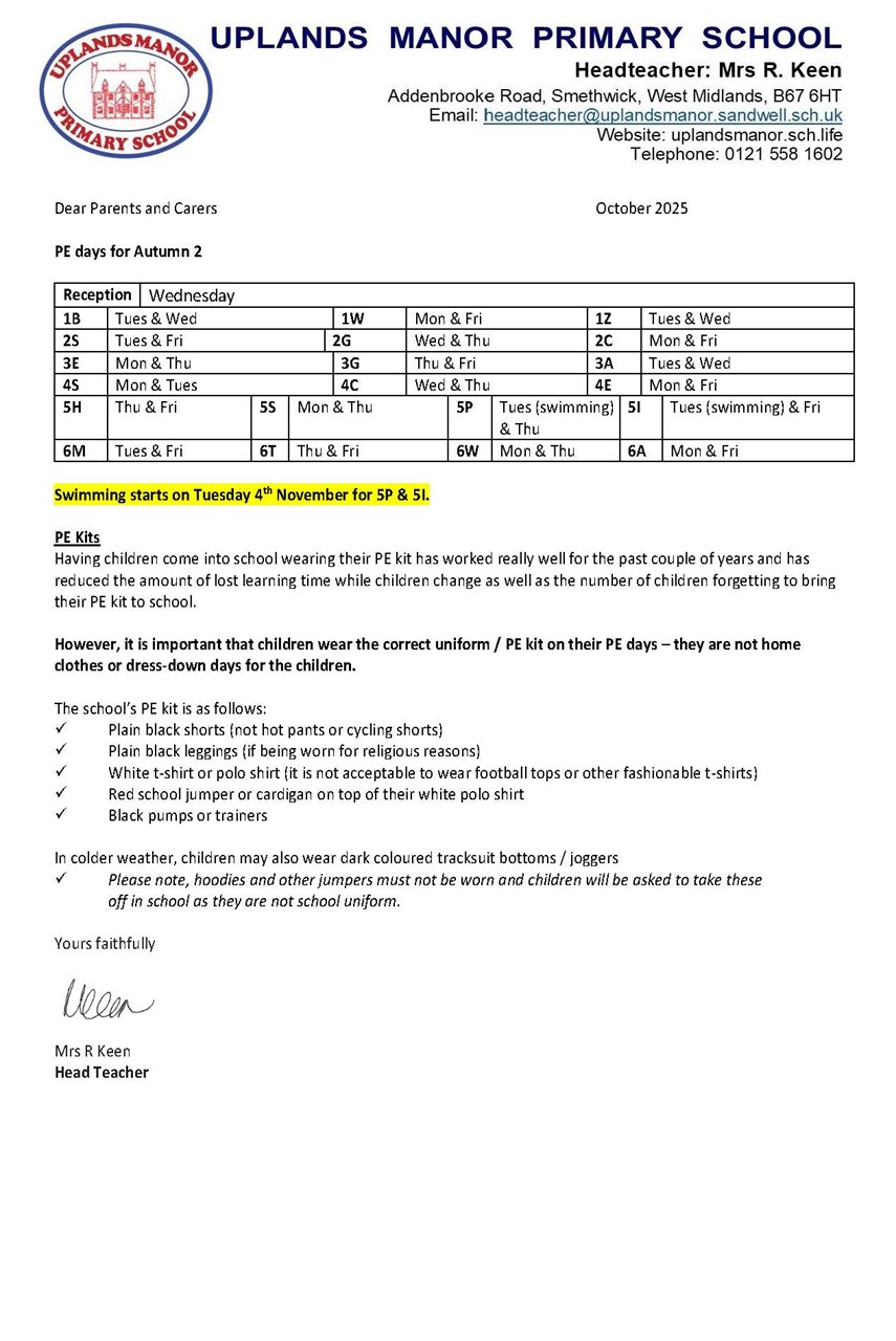 Below is the list of days when your child's class will be doing PE. Please check the letter for information about PE kits.