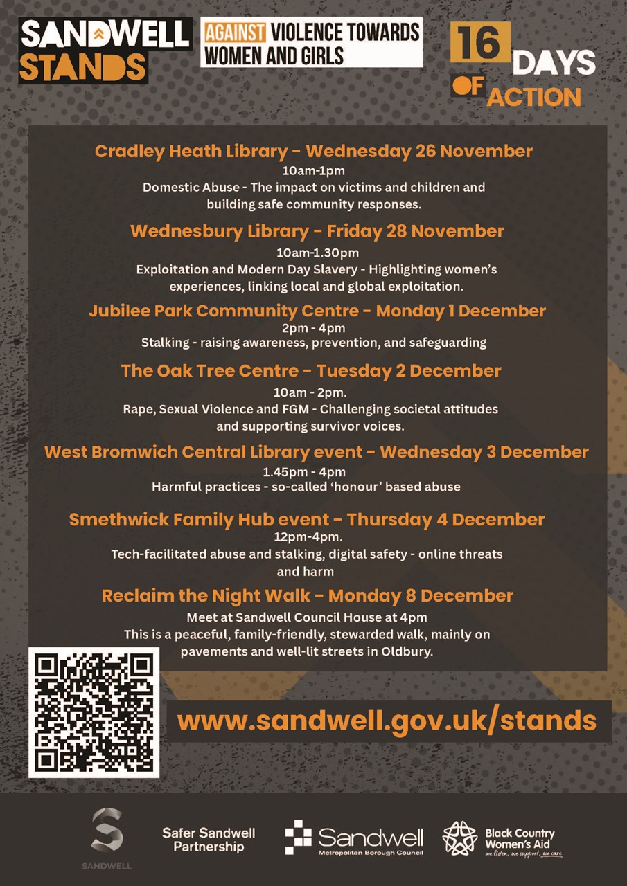 Running from 25 November to 10 December, the campaign includes events across Sandwell’s six towns, focusing on issues such as domestic abuse, stalking, online safety, and sexual violence. A key highlight is the Reclaim the Night Walk on 8 December – a peaceful, family-friendly event to show solidarity and raise awareness.